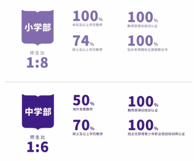 4、中学部硕士教师占比70%,小学部硕士教师占比74%,拥有海外背景教师占比50%,教师****拥有IB培训认证;