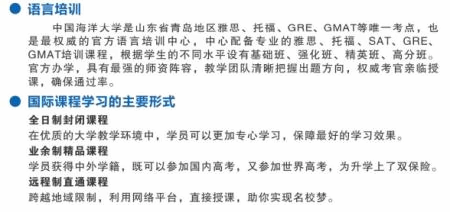 中国海洋大学是教育部直属985、211重点大学,海大剑桥国际学校是剑桥大学国际考试委员会直接授权的全日制国际教育考试中心,主要从事国际高中(A-Level、IGCSE、SAT)、国际本科预备课程、国际硕士的课程教学与考试以及雅思、托福语言培训等。