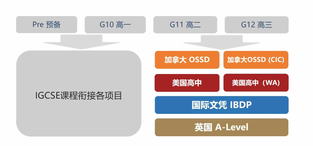 入读燎原高中国际课程班低年级学生不急于确定课程方向,学校提供桥梁课程,帮助学生尽快适应并作出最适合自己的选择。学生如果选择美国高中项目和加拿大高中项目,12年级都将前往当地合作院校就读,帮助学生尽快融入适应海外留学生活;如果选择A-Level项目或IB DP项目则在燎原本校就读。同时,进入国际化课程后也可根据情况做调整。