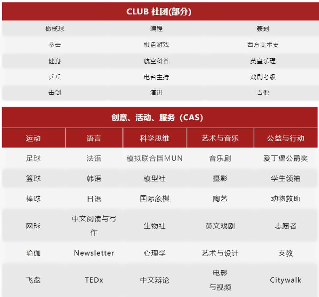 50余门CAS(创意、活动、服务)拓展课程及学生社团,涉及体育运动、艺术设计、音乐、科学、外语、影视戏剧、公益等类目。