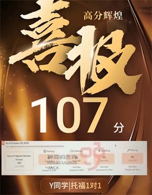 从首次考试的85分,到本月斩获的107分,短短两个月内实现了质的飞跃!他的秘诀在于坚持不懈的听力训练和高效的口语模拟,用实际行动诠释了“努力终将回报”的真谛。