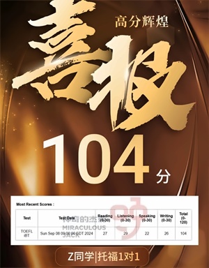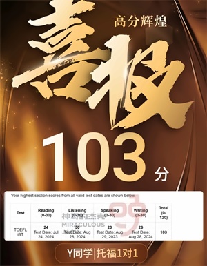 以听力满分30分、写作26分的惊人成绩,轻松迈入托福103分的高分殿堂。她的秘诀是每日雷打不动的词汇积累和精准的阅读策略,证明了扎实基础是通往成功的必经之路。
