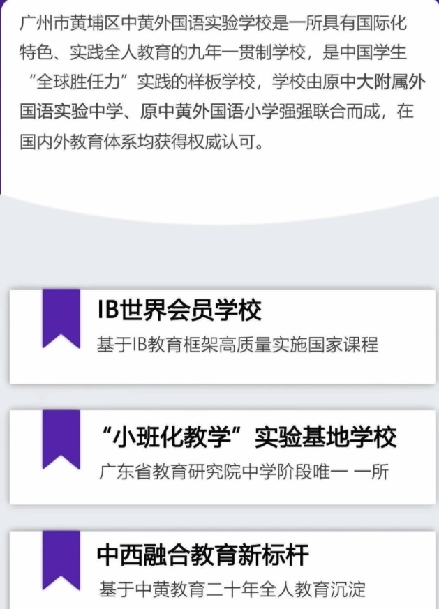 广州市黄埔区中黄外国语实验学校是一所具有国际化特色、实践全人教育的九年一贯制学校,是中国学生“全球胜任力”实践的样板学校,学校由原中大附属外国语实验中学、原中黄外国语小学强强联合而成,在国内外教育体系均获得权威认可。