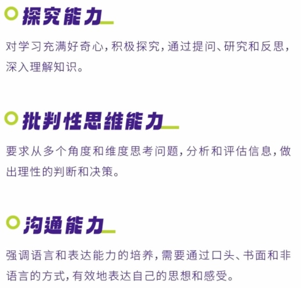 综合素养层面:考察他们在思考、研究、沟通、社交以及自我管理等技能方面的发展和进步。