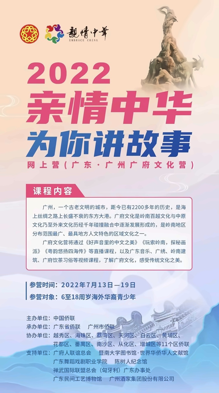 7月13日,由中国侨联主办,广东省侨联、广州市侨联承办的“2022亲情中华·为你讲故事”网上营(广东广州广府文化营)正式开营。