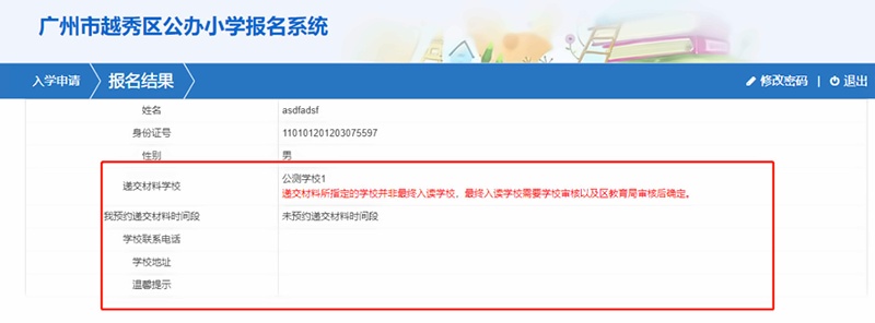 公测的主要目的是为了让家长熟悉网上报名操作流程,使家长们在正式报名填写信息的时候可以更加顺畅。本次公测中,公办小学报名系统的“报名结果”中的“递交材料学校”非实际递交材料学校,公测期间会用“公测学校1”、“公测学校2”……代替(见图1),并且不提供网上下载打印功能,在正式报名的时候会按实际恢复正常。