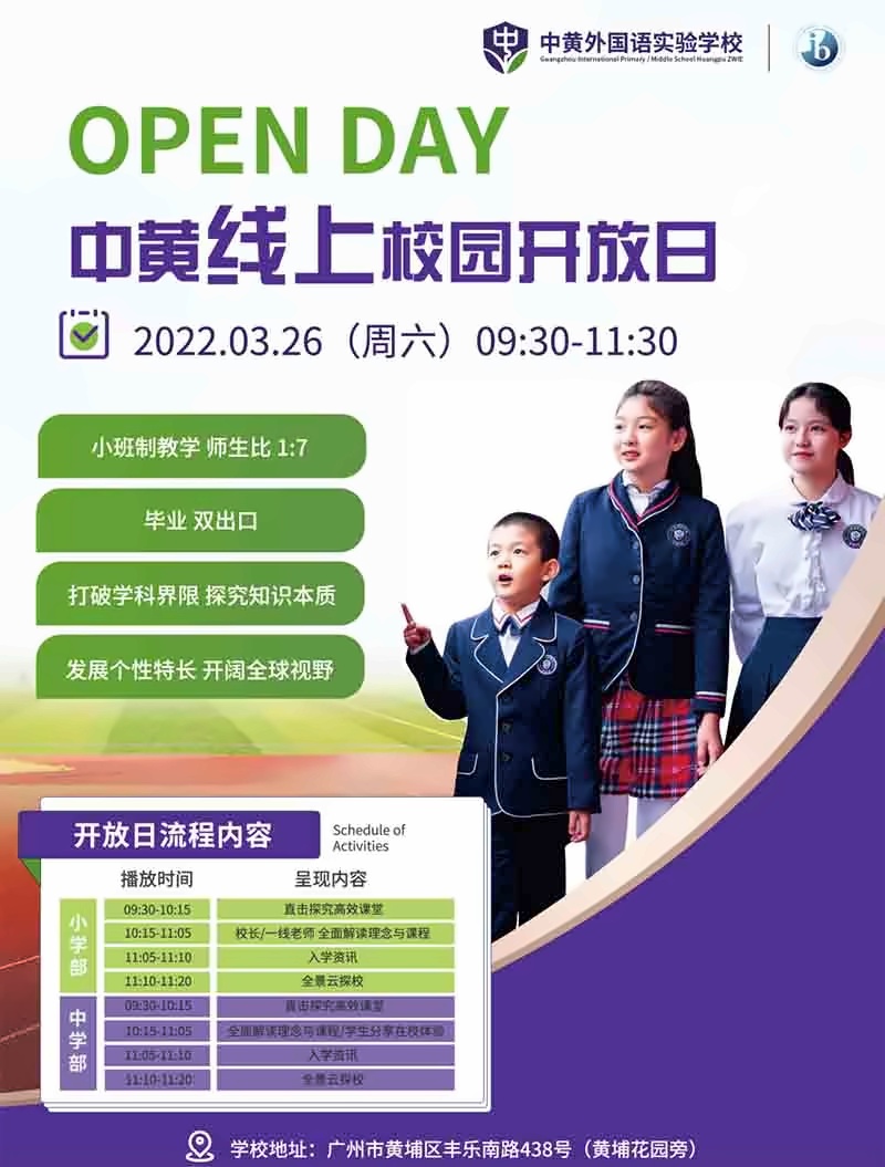 进入3月,不少家长已经踏入了择校“焦虑持久战”,卯足了劲,只为娃寻得一所好学校。考虑到当下疫情防控的形势,为了**防疫万无一失,同时也满足家长们的参观了解需求。3月26日,广州市黄埔区的九年一贯制IB(国际文凭)世界会员学校——中黄外国语实验学校将举办线上校园开放日,暂别人头攒动的校园开放日,让每一位家长坐在最前排!家长们可以了解真实的课堂,看到老师和孩子们在学习中最真实的状态,感受学校的教育细节。