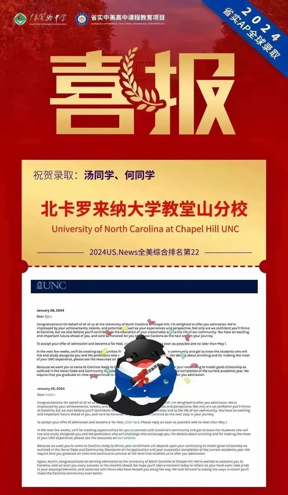 热烈祝贺汤同学、何同学斩获北卡罗来纳大学教堂山分校(全美综合排名#22)录取offer