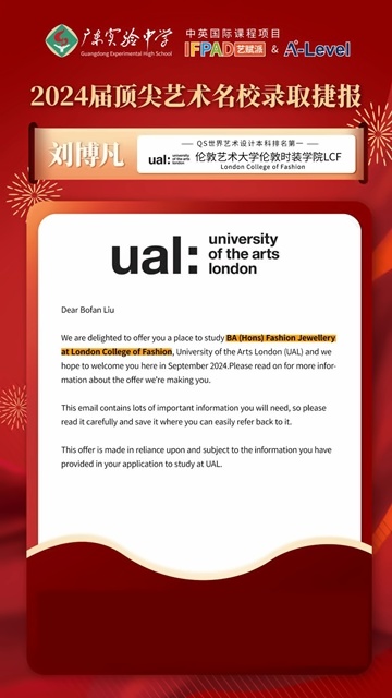 热烈祝贺省实IFPAD2024届刘博凡同学斩获世界知名时尚设计院校,QS世界大学艺术设计本科**伦敦艺术大学伦敦时装学院,时尚珠宝设计专业录取offer