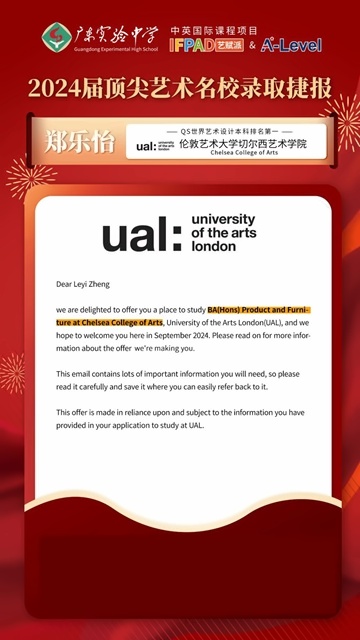 热烈祝贺省实IFPAD2024届郑乐怡同学斩获全世界最优秀的艺术学院之一QS世界艺术设计本科排名**伦敦艺术大学切尔西艺术学院产品与家具设计专业录取offer