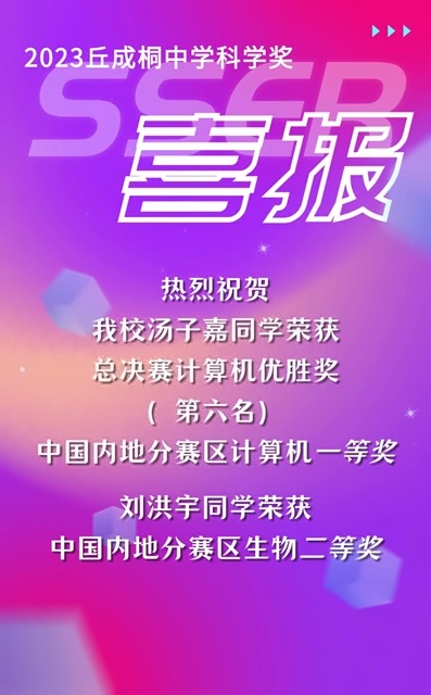 热烈祝贺广东实验中学国际部AP国际课程项目的汤子嘉同学荣获总决赛计算机优胜奖( 第六名)中国内地分赛区计算机一等奖、刘洪宇同学荣获中国内地分赛区生物二等奖