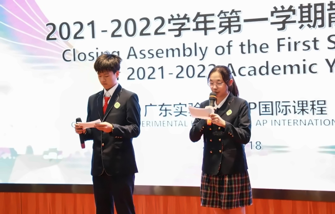 时光荏苒又一年,伴随着学子们的成长与收获,一个学期圆满结束。为表彰优秀与回顾总结,1月18日,广东实验中学国际部AP班于学术报告厅举行了2021-2022学年**学期散学典礼,广东实验中学党委副书记朱伯东、新哲教育集团副总经理尹曾、省实AP国际课程副校长杜虹、省实AP国际课程教学处主任梁家玮,以及省实AP全体师生共同出席本次活动。