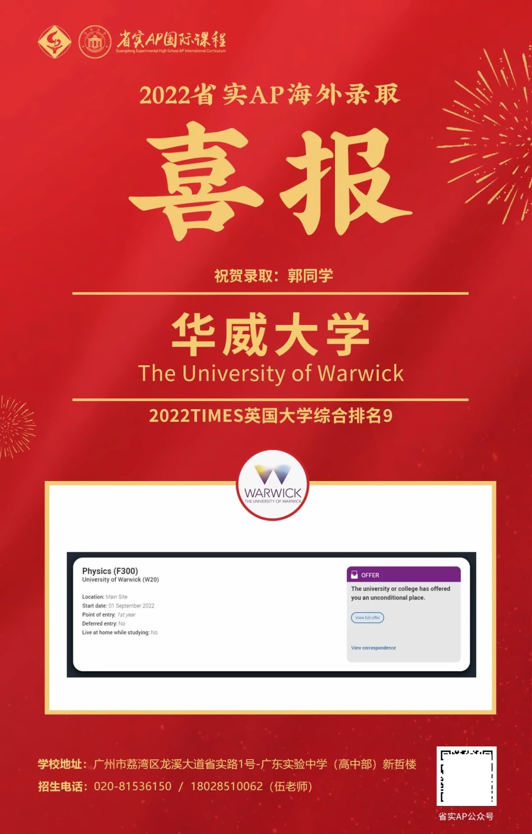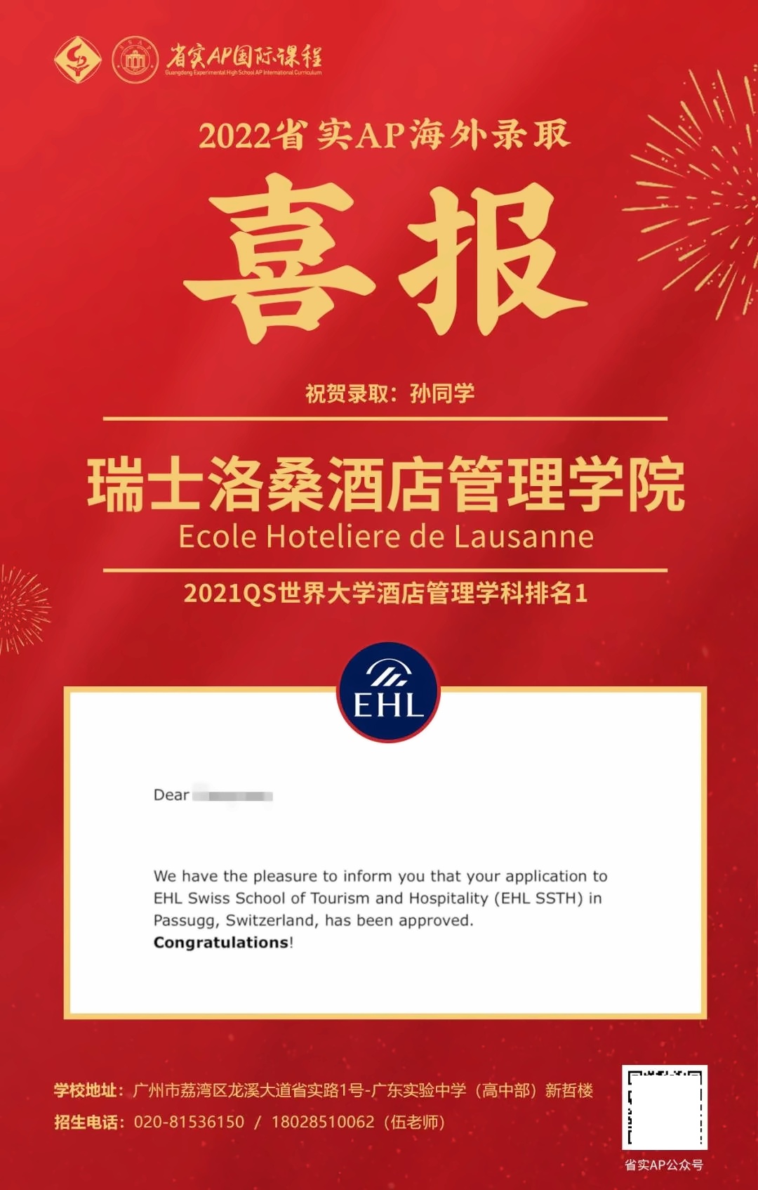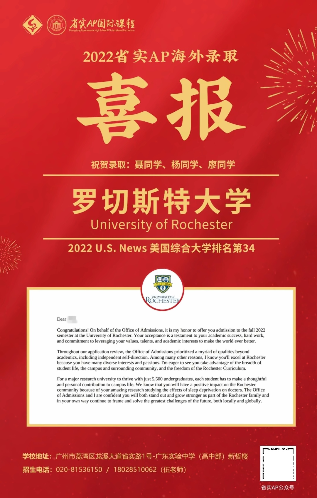海外大学早申录取陆续放榜,一封封接踵而至的offer,是对每一位优秀学子的**认可;世界各地院校抛来的橄榄枝,更是对广东实验中学国际部开设的AP课程全球联申优势的有力证明!