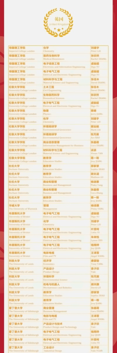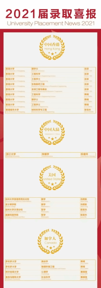 2021届常外双语共计35名毕业生以优异的学术表现和全面的综合素质,收获全球各类发出的共计138封录取通知书。申请英国方向学生中,4位同学斩获英国超精英大学、世界大学排名第8位的帝国理工学院录取,收获G5超精英大学预录取通知15枚,英国前10大学预录取通知共计21枚。申请中国中国香港方向学生中,共计获得包括中国香港大学、中国香港城市大学在内共计8封录取。本届毕业生权同学作为CBS首位外籍毕业生,获得浙江大学传播学录取,同时也收获了上海交通大学笔面试通知。