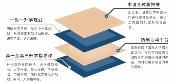 我校为学生提供 一站式升学规划及指导 ,定期组织学生家长、班主任、升学规划导师、学生进行“四方会谈”,在沟通中使家长详细了解孩子在校的真实近况,并帮助学生 从入学开始就逐渐清晰自己的留学目标。 同时,我们根据学生的专业申请需求联络合适的活动资源平台,打造独特的个性化背景。