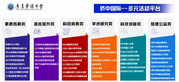 作为公立学校的中外合作办学项目,侨中国际是广东华侨中学教育体系中的重要组成部分之一。为了更好培养学生全面发展, 我们 积极利用本部校内资源和国际资源, 开展各类国际交流活动,如 校内社团、志愿者公益服务、海外研学项目、姊妹学校互动、商科竞赛 等,使学生在课余时间丰富自己的生活体验,提升综合素质,拓展国际视野,充分展现了其兼具中华情怀与国际视野的办学特色。