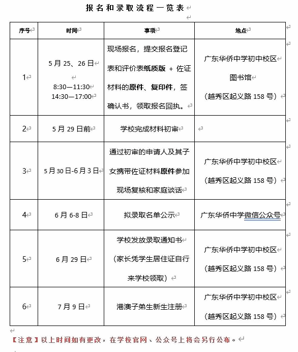 6月6-8日学校公示拟录取名单,在广东华侨中学“”进行为期三天的公示。6月29日由学校发放录取通知书。