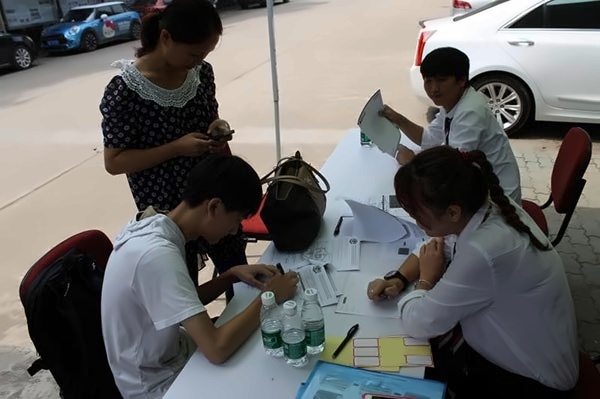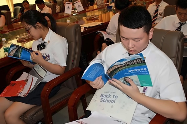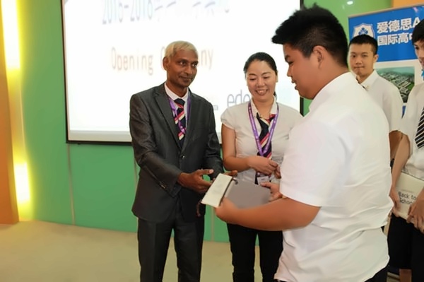 HeadTeacher和中心主任一起为同学们颁发新生入学材料,并佩戴国际高中徽章。