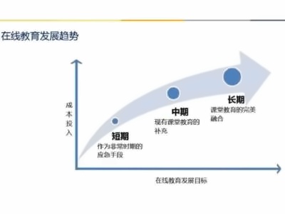 长期, 在线教育和现有课堂教学模式无缝结合,两者同时构成学校教学的整体。这样的投入较大。未来学校的长期在线教育将会是这样一种情形:学校有自己的服务器等硬件配置,包括网络基础的系统,有账号系统、数据库系统。虽然各种前期成本大,但是随着时间的推移,收效也会越来越大。
