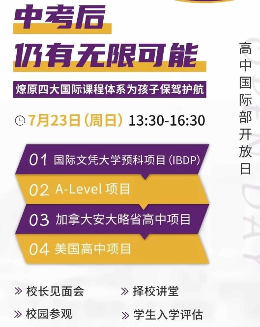 7月23日高中国际部秋招一场开放日,现已开始!如何更好地为孩子择校,什么样的孩子适合国际化教育?来燎原与教育大咖共话国际化教育,打开升学思路,为孩子规划未来吧! 【点击燎原双语开放日】