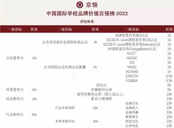 此榜单从认证、师资、行业影响力、社会影响力等方面综合评估国际学校品牌价值。