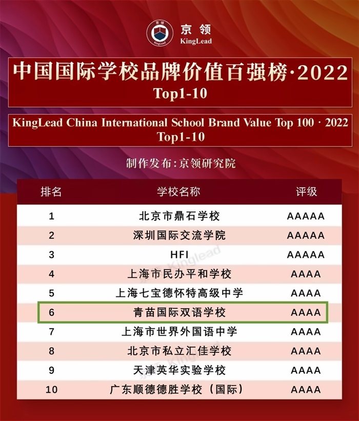 青苗学校 凭借20余年的综合教育实力和品牌价值,从全国1000余所国际学校中脱颖而出, 荣居《中国国际学校品牌价值百强榜》全北京第二名,全国第六名 。