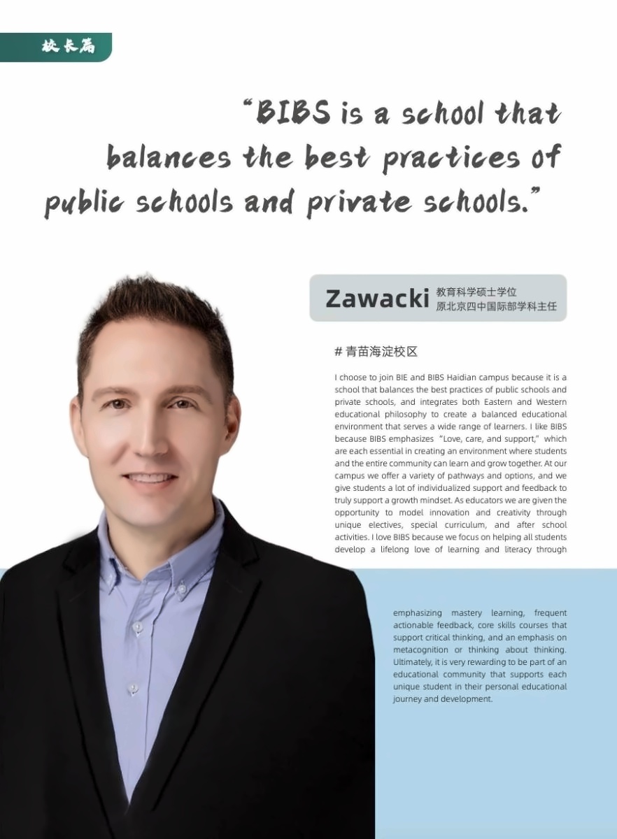 我选择加入青苗学校,是因为这所学校是平衡了公立学校和私立学校的最 佳实践,它融合了东西方的教育理念,创造了一个均衡的教育环境,服务于广泛的学习者。