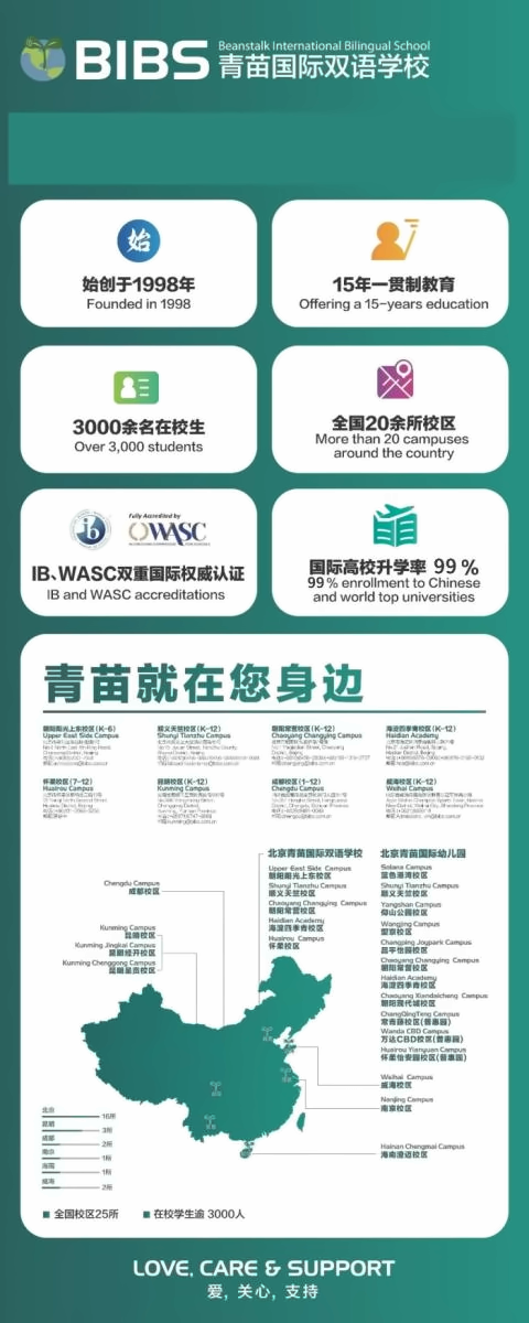 青苗始创于1998年,作为由中国人创办的国际双语教育品牌,较早开创中西方教育结合办学新模式。秉承“采中西合璧之萃,品文化融合之美”核心价值观二十余年,现已发展成为“涵盖幼儿园到高中”十五年一贯制教育集团,目前在全国范围内拥有20余所校区。