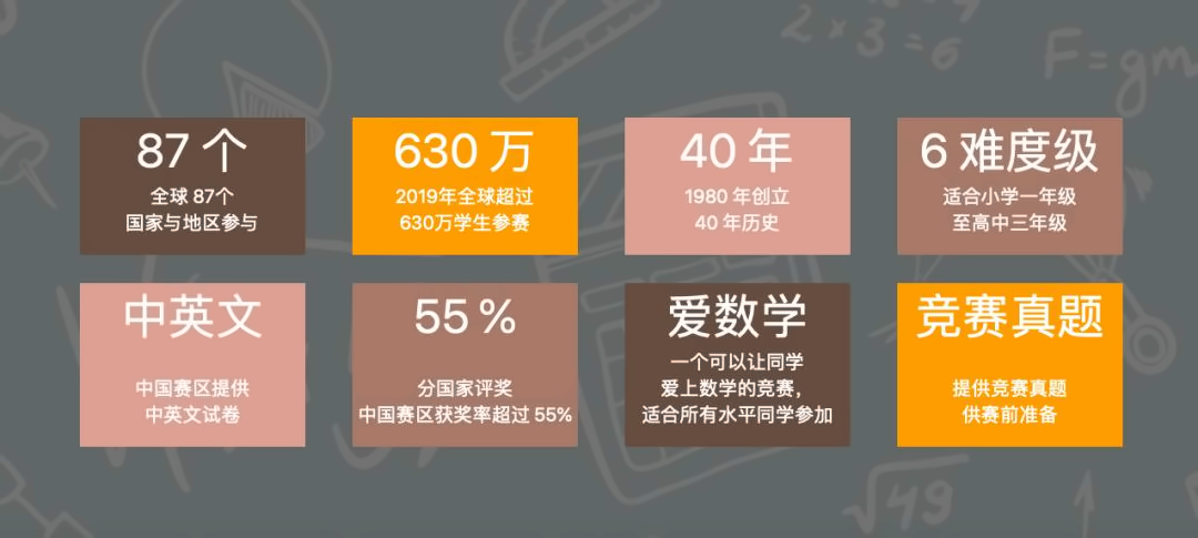 由澳大利亚数学家 Peter O’Halloran 于 1980 年发起,不同于传统数学奥赛强调的高难度和挑战性,袋鼠数学竞赛宗旨是用有趣生动、接近生活的题目,激发孩子们数学学习兴趣及自信,培养学生数学思维,训练学生阅读、理解、分析和解决问题能力。因此袋鼠数学竞赛逐步风靡世界,成为全球极具影响力的青少年国际数学竞赛,87 个国家和地区举办、每年超过 600 万学生参加。