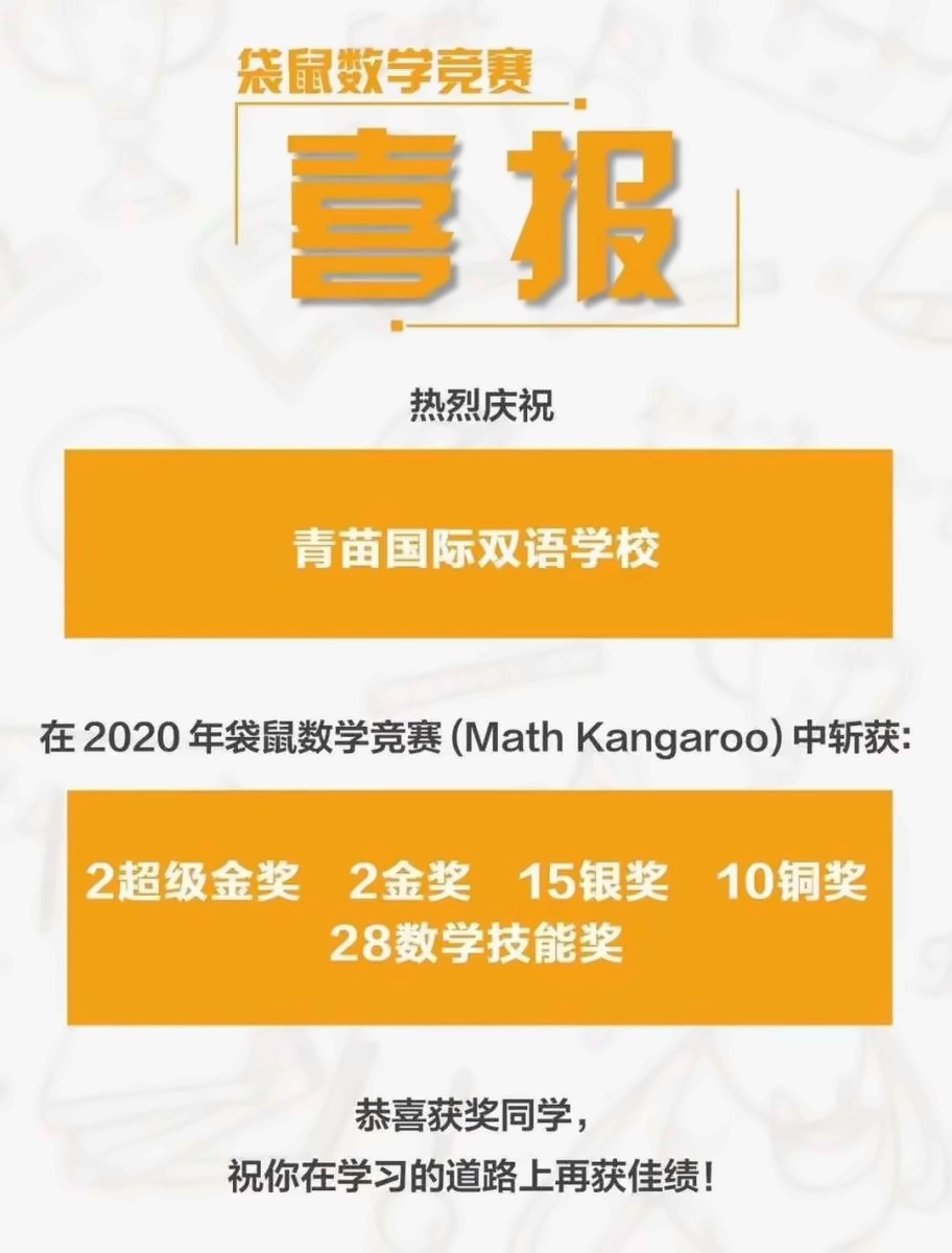 热烈庆祝青苗学校在2020 年袋鼠数学竞赛 (Math Kangaroo)中斩获多项大奖!此次中国赛区共有来自中国大陆30多个省份、230多个城市的近22000名学生参赛,青苗上东、顺义、常营、昆明、成都五所校区强强联手,青苗小将不畏强敌、初战告捷!