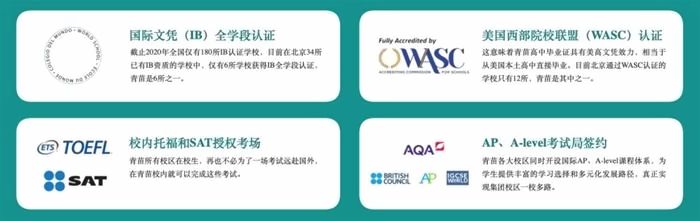 始创于1998年的青苗学校,不仅拥有WASC认证,IB(PYP、MYP、DP)全认证,A-Level认证,AP认证,托福、SAT校内考点,还拥有专业管理团队。