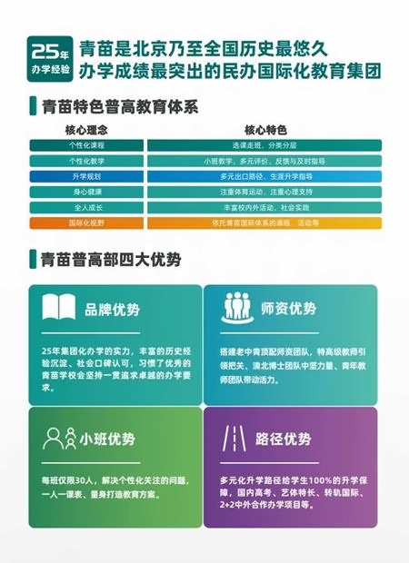 青苗致力于将学生培养成为具备双母语能力、多文化视角和全球化意识的未来力量,使他们同时拥有广博的知识和正直的品格,能够在不断发展的全球化环境中有担当、有作为,并较终成为各个领域的领军人物,让我们的孩子“走得出、回得来、留得住”。 【点击青苗普高】