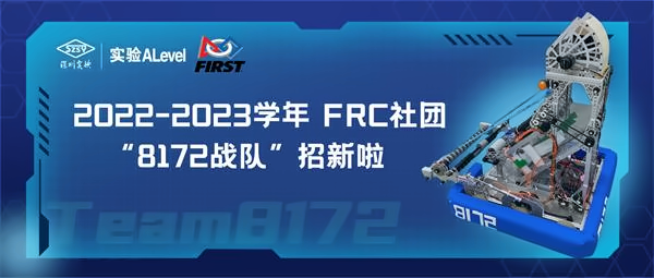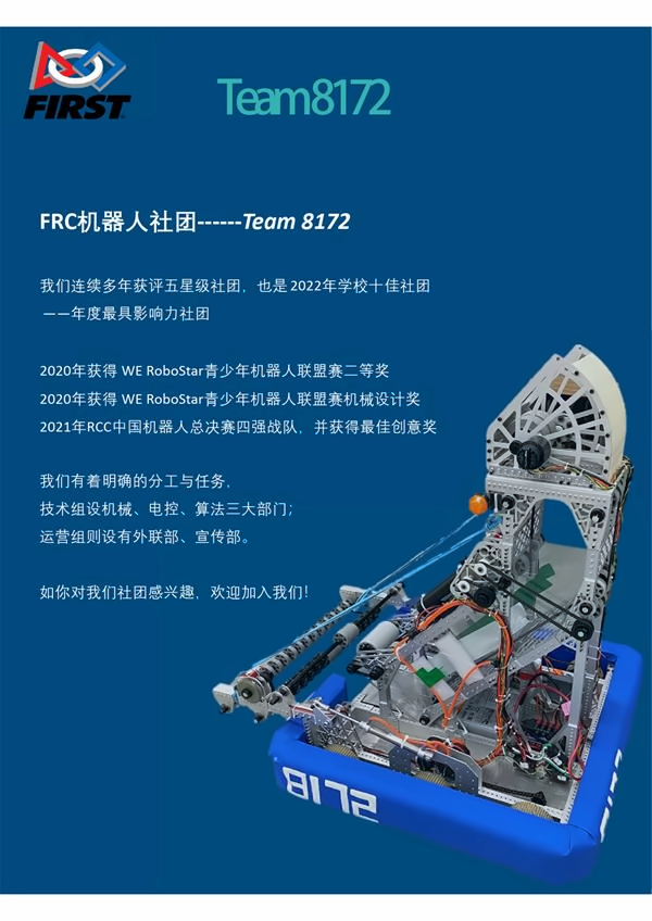FRC社团“8172战队”在彭校长、周老师的护航下,在队员们的努力下,逐渐成长为一支有组织、有纪律、有目标、有输出的成熟团队。通过机器人,这些年轻人正在构建一种更有机、更广阔的生活。2022-2023新学年的开始,FRC社团“8172战队”也开始进行招生,欢迎各位感兴趣的同学们向班主任报名。