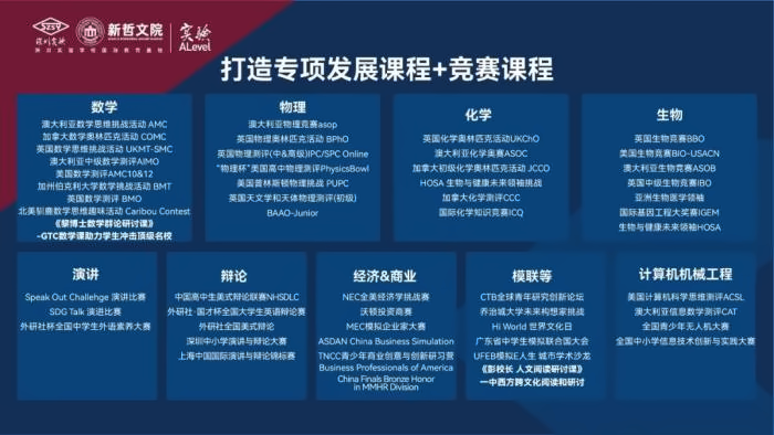 为了全面提升学生更深层次的学科能力和思维能力,深圳实验学校国际教育基地 精心设计了9大类共53种专项发展及竞赛课程,构建了丰富且完善的竞赛培养体系 。在这里, 每个学生都能找到适合自己的赛道 ,发掘自己独特的闪光点。