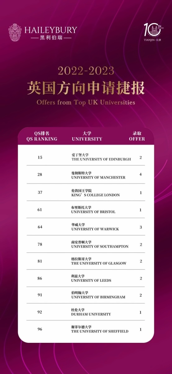 天津黑利伯瑞建校十年来,凭借卓越的教育理念,培养了众多优秀学子。她的育人成绩,遍布全球。一份份喜人的Offer,见证了他们的奋力拼搏。他们即将踏上人生新的旅程,来到全球世界各地。希望你们永葆向上的力量,坚持梦想,创造更多的奇迹!